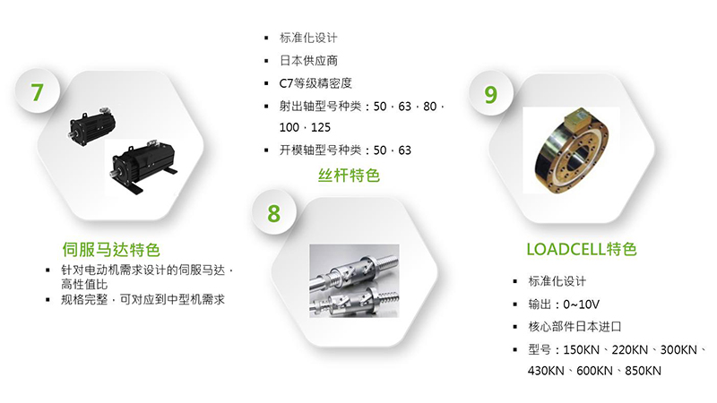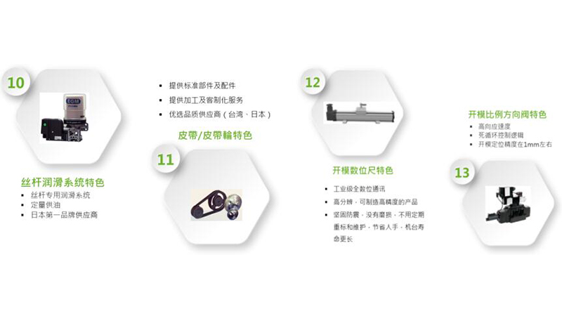 射出結(jié)構(gòu)選配線性導(dǎo)軌支撐,確保射出物理摩擦小,運動速度控制更精密、能耗更低。